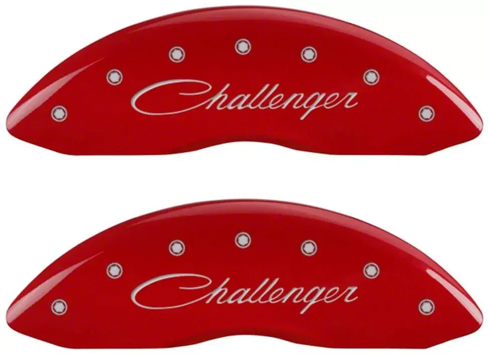 Description. Disc Brake Caliper Cover; Set of 4 caliper covers, Engraved Front and Rear: Cursive/Challenger, Red powder coat finish, silver characters.